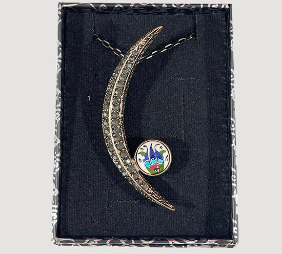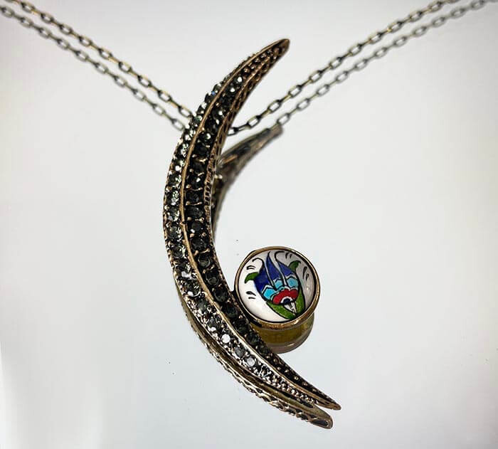Anemon Motifli Yarım Ay İznik Çinili Bronz Kolye,