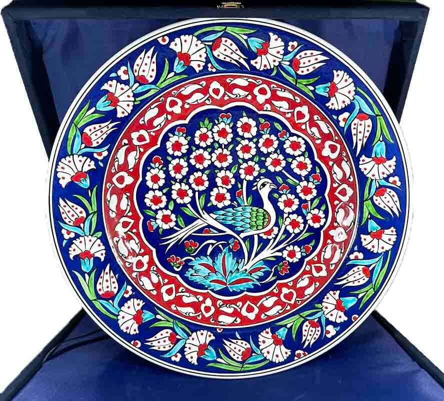 Cette assiette en céramique d’Iznik de 30 cm, entièrement peinte à la main, est un hommage vibrant aux jardins du paradis tels qu’imaginés dans la culture islamique et ottomane. Elle présente une composition florale riche en symboles : tulipes, jacinthes, grenades, paons… Chaque élément célèbre la beauté, la fertilité, la paix et la spiritualité. Présentée dans un coffret en bois habillé de velours, c’est une œuvre d’art intemporelle à offrir ou à transmettre.
