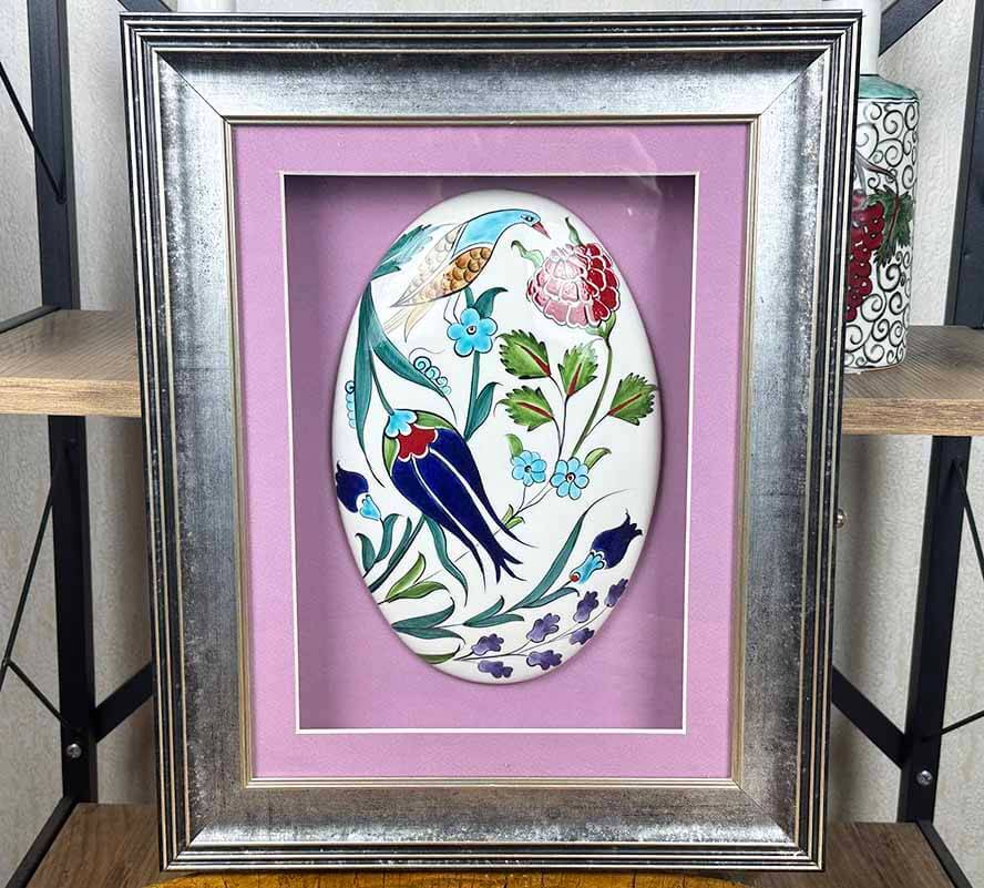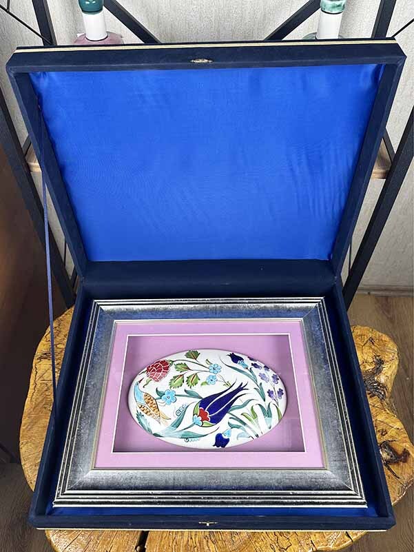 Yeni ev hediyesi, özel gün armağanı veya kalıcı ve anlamlı bir sanat eseri arayanlar için uzun yıllar değerini koruyacak nitelikte hazırlanmıştır. Geleneksel sır altı İznik çini tekniği ile usta zanaatkârlar tarafından el yapımı olarak üretilmiş; paspartulu ve çerçeveli şekilde sunuma hazır hâle getirilmiştir.