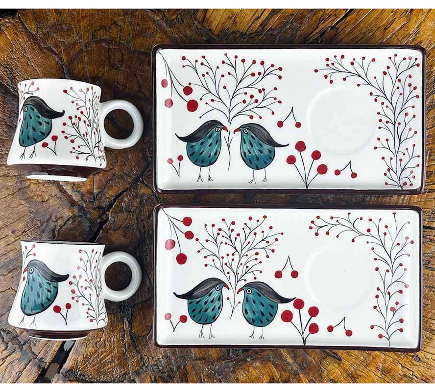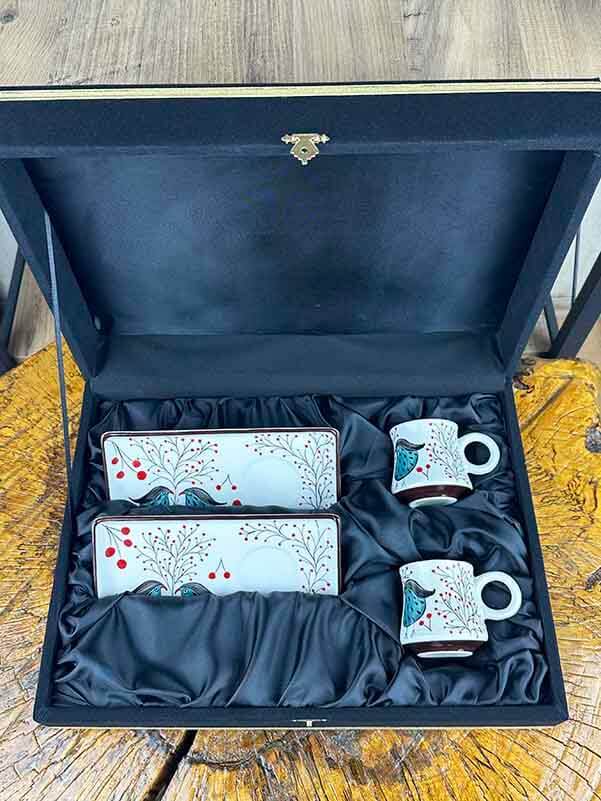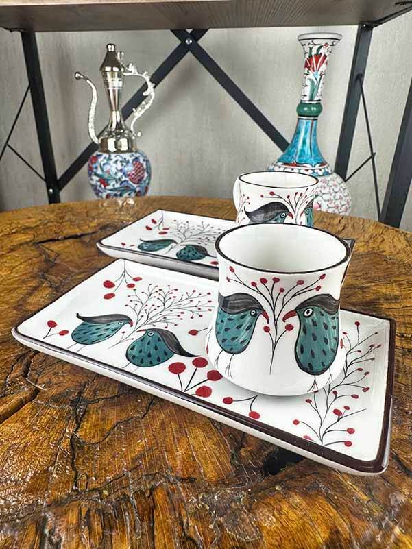 İznik çini sanatının karakteristik sır altı tekniğiyle hazırlanan bu özel set, her bir çizginin el emeğiyle işlendiği benzersiz bir işçilik taşır. Günlük kahve sunumlarında sakin ve huzurlu bir atmosfer yaratarak aynı zamanda modern iç mekânlarda dekoratif bir obje niteliği kazanır.