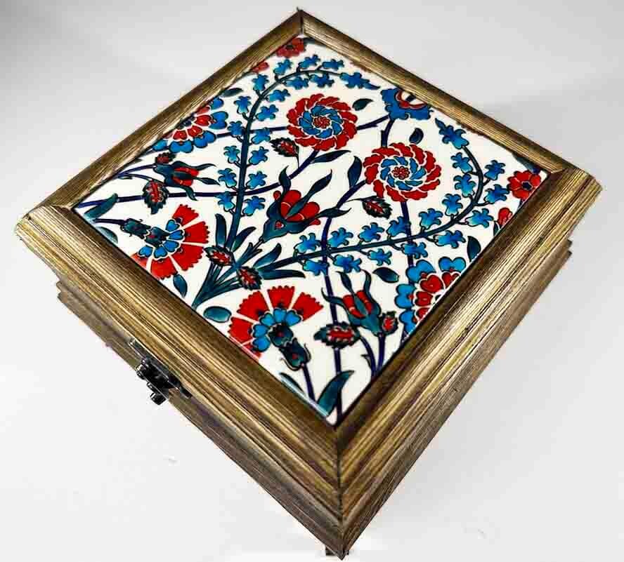 Cette élégante boîte en bois, parfaite comme idée cadeau de bureau, est ornée d’un carreau en céramique imprimée inspiré des célèbres céramiques d’Iznik. Elle allie fonctionnalité et esthétique, idéale pour ranger des objets personnels, des bijoux ou des accessoires de bureau.