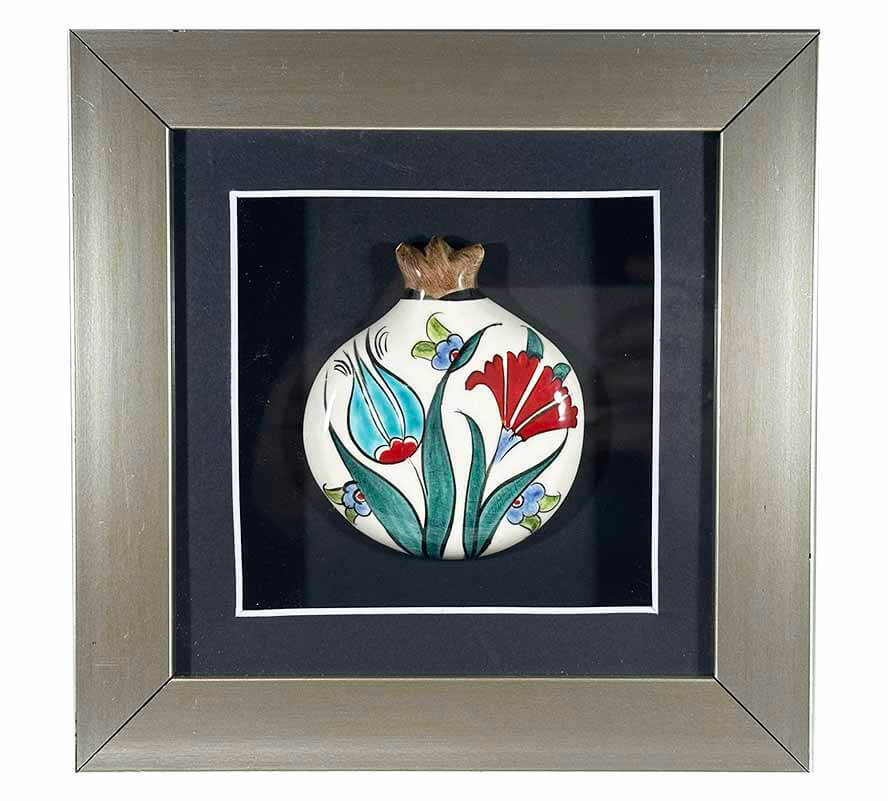 Çifte Zarafet – İznik Çinili Nar Plaket, renklerin uyumu, anlamlı motifler ve geleneksel İznik çini sanatını bir arada sunan zarif ve zamansız bir dekoratif eserdir.