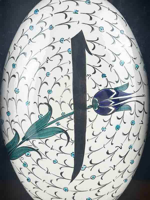 Osmanlı çini sanatında Haliç motifleri, akışkanlık, süreklilik ve uyum duygusu verir. İstanbul Haliç’inden ilham alan kıvrımlı desenler, kompozisyona hareket ve derinlik kazandırırken ana sembolleri öne çıkarır. Bu eserde Haliç üslubu, Elif ve lale motiflerini çevreleyerek bütünlük ve denge hissini güçlendirir.