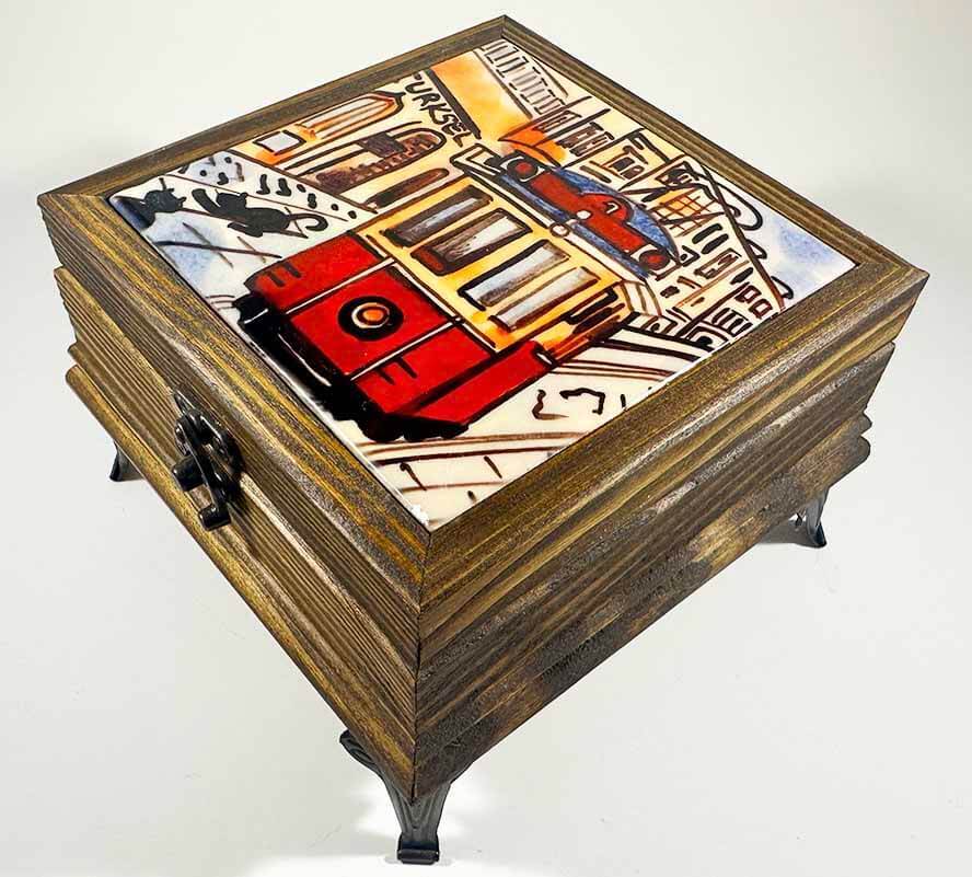 Product Description: This elegant storage box, featuring a nostalgic tram design symbolizing Istanbul, is handcrafted with a ceramic tile coating. Its refined design and high-quality craftsmanship make this box not only a stylish decorative item but also an ideal option for storing your precious items. A perfect gift alternative for anyone wishing to feel the enchanting atmosphere of Istanbul in their home.