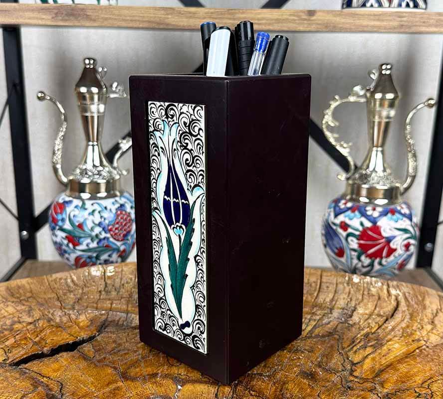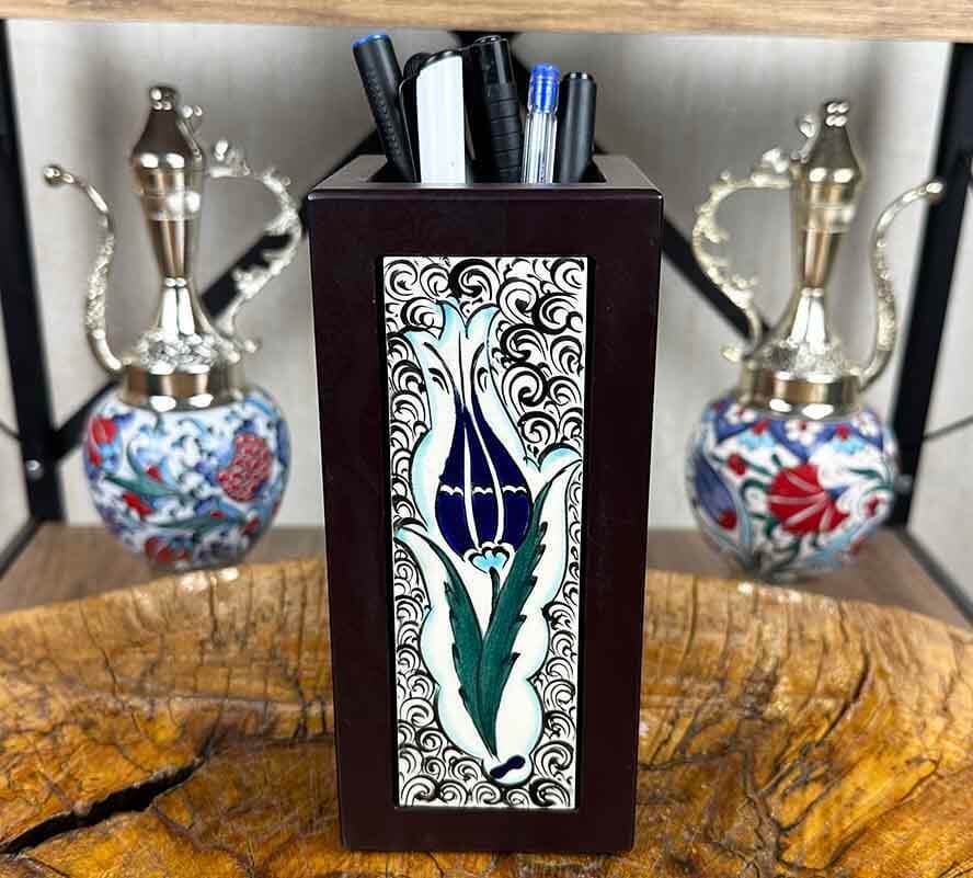• Ahşap gövde üzerine çini taş uygulamalı dekoratif kalemlik