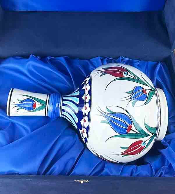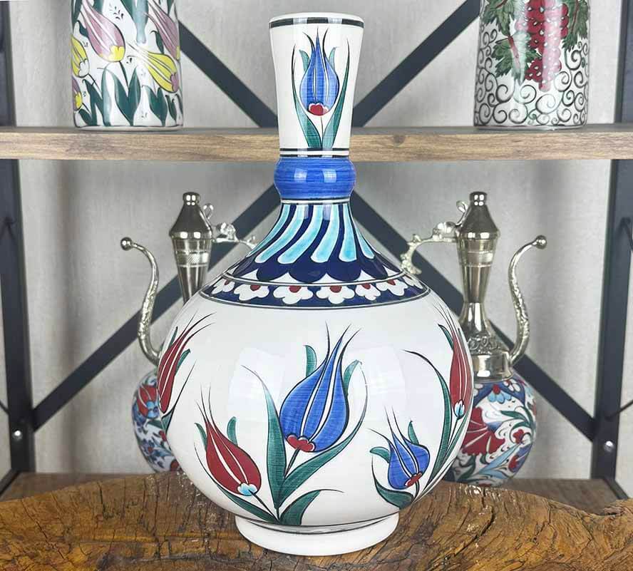 Her biri usta zanaatkârlar tarafından el işçiliğiyle boyanan bu İznik çini vazo, sır altı tekniğiyle üretilmiş ve 800–1000 °C arasında fırınlanarak renklerin kalıcılığı sağlanmıştır. El yapımı üretim süreci nedeniyle her parça kendine özgüdür; birebir aynısı tekrar üretilemez.