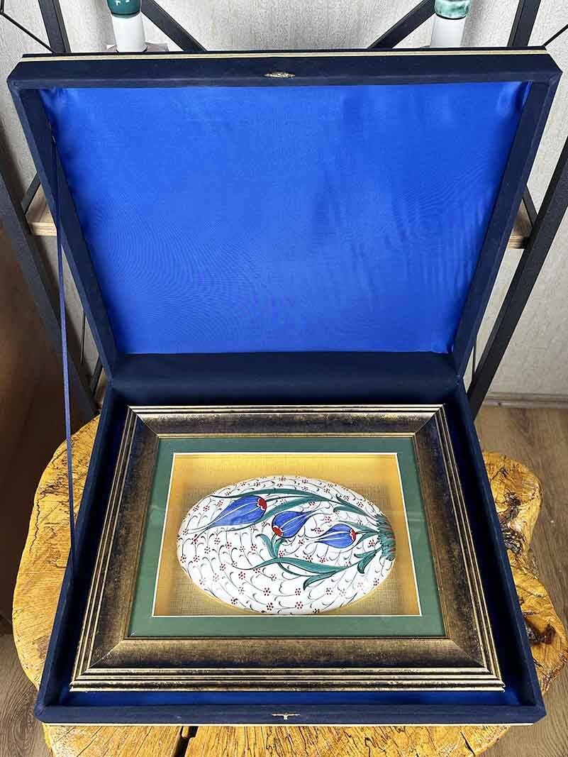 Evlerde, ofislerde, temsil alanlarında ve özel mekânlarda rahatlıkla sergilenebilen bu eser; özellikle kurumsal ziyaretler, yeni ev hediyesi, özel günler ve protokol hediyeleri için kalıcı ve anlamlı bir tercihtir. Geleneksel sır altı İznik çini tekniği kullanılarak, usta zanaatkârlar tarafından el yapımı olarak üretilmiş ve VIP sunuma uygun şekilde hazırlanmıştır.