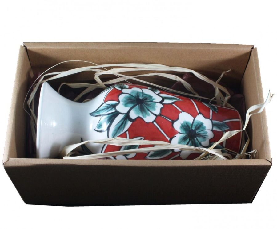Handmade red background Iznik ceramic vase with floral design, along with its elegant box.