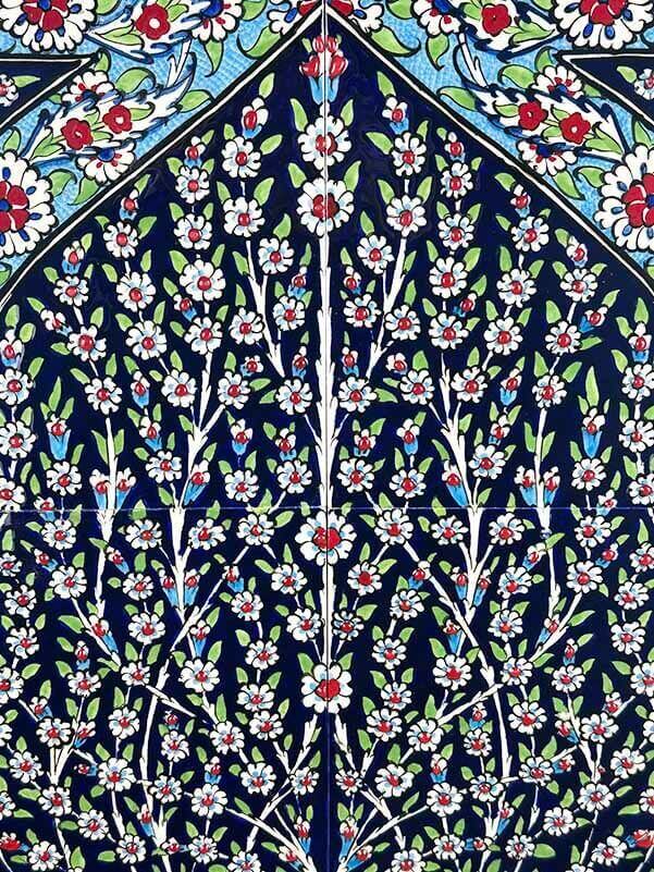 Bu pano, 6 adet 20 × 20 cm ölçülerinde İznik çini karonun bir araya gelmesiyle oluşturulmuştur. Sıraltı tekniği ile hazırlanan ve 800–1200 °C arasında fırınlanan İznik çinileri, canlı renkleri ve dayanıklı yüzeyi sayesinde uzun yıllar boyunca ilk günkü zarafetini korur.