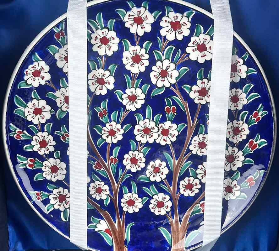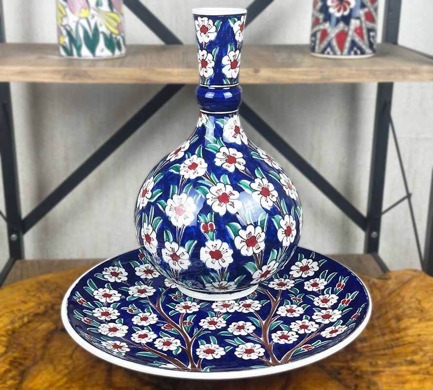 Lacivert zemin üzerinde yükselen beyaz çiçekli dallar, bu özel sette hayat ağacı anlayışını zarif ve etkileyici bir kompozisyonla buluşturur. Vazo ve tabağın aynı desen diliyle hazırlanmış olması, ürünü yalnızca dekoratif bir takım olmaktan çıkarır; anlam taşıyan, kültürel değeri yüksek ve bulunduğu ortama estetik güç katan özel bir İznik çini setine dönüştürür.