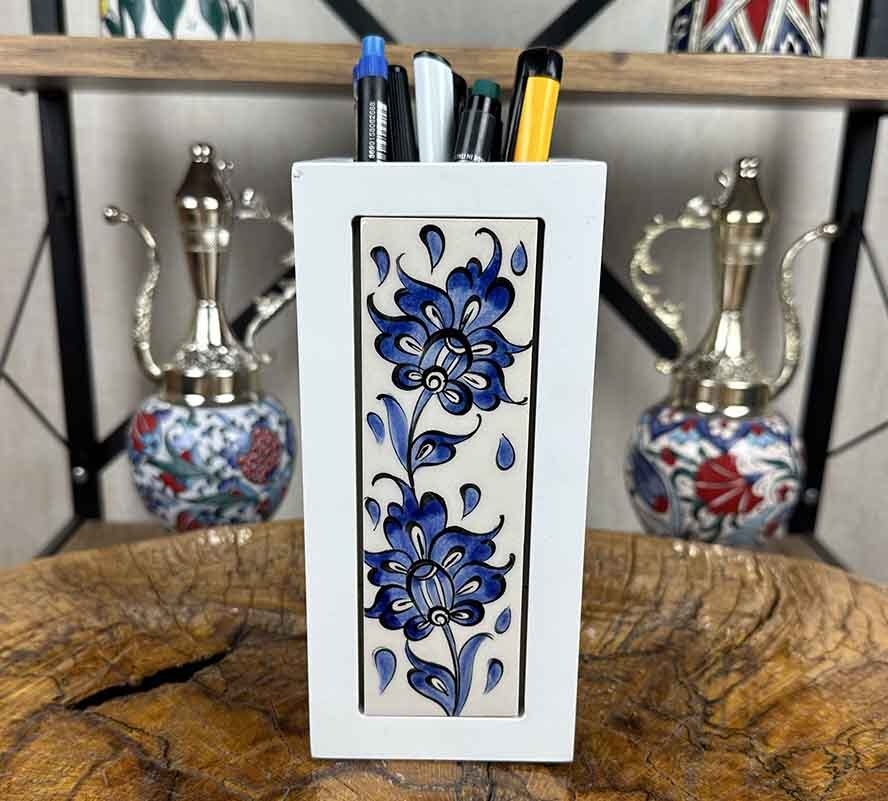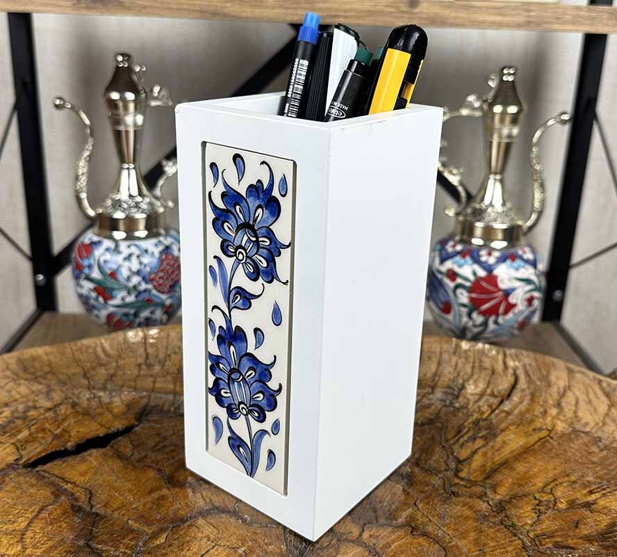 Beyaz ahşap yüzey ile çini taş üzerindeki güçlü renk dengesi, ürünü sıradan bir kalemlikten ayırır. Kullanım amacı nettir; görünümü ise dekoratif ve akılda kalıcıdır. Bu yönüyle hem kişisel kullanım hem de hediye alternatifi olarak güçlü bir tercih oluşturur.