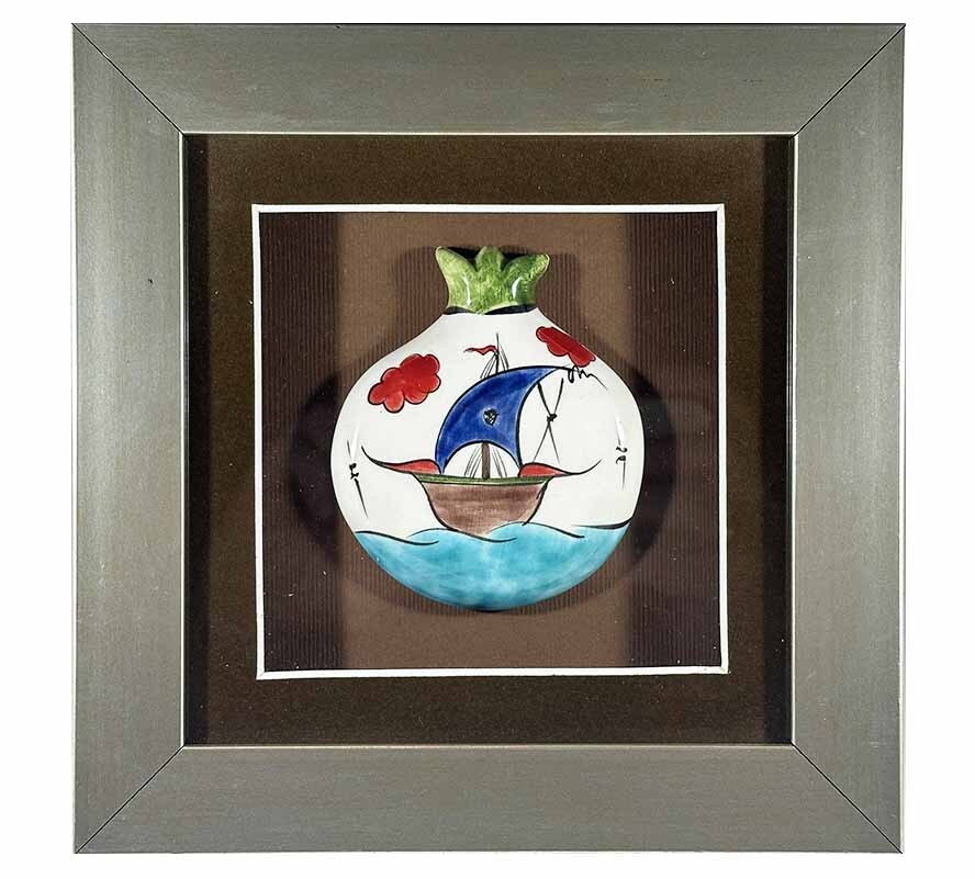 “Kalyon”, tarihî yelkenli gemi motifini narın bereket sembolüyle bir araya getiren özel bir İznik çini tasarımıdır. Mavi dalgalar üzerinde ilerleyen kalyon, canlı kırmızı bulutlar ve el yapımı detaylarla birleşerek sanat ve anlamı tek eserde buluşturur. Koyu paspartu, metalik çerçeve ve doğal çini dokusu ile hem modern hem klasik dekorasyonlara uygun zarif bir ürün ortaya çıkar.