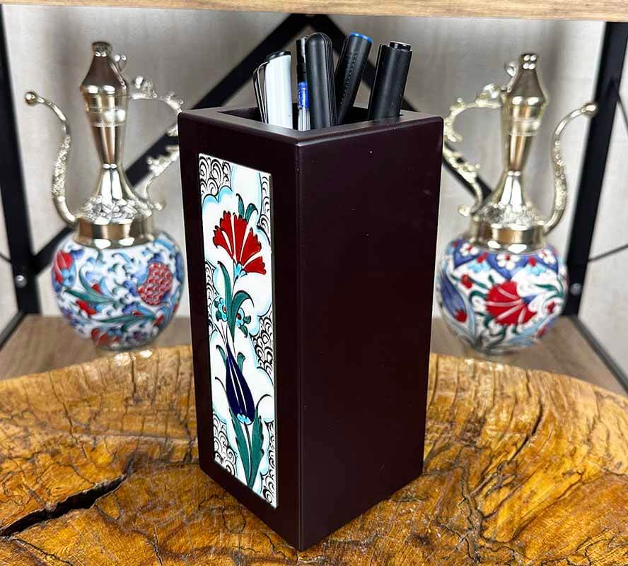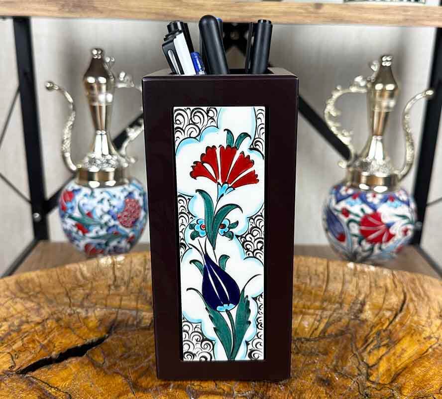 Karanfil ve Lale Zarafeti – İznik Çinili Ahşap Kalemlik