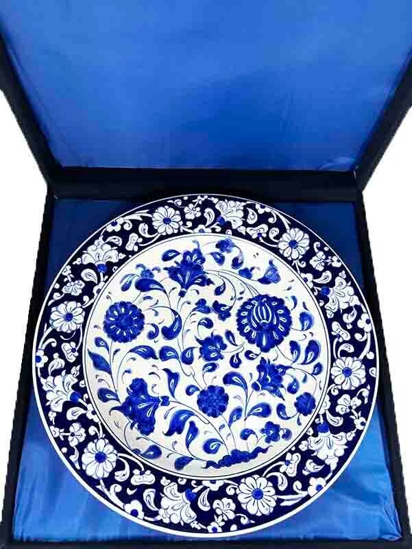 Ein edles Präsent mit tiefer symbolischer Bedeutung: Dieser vollständig handgefertigte İznik Keramikteller mit blau-weißem Lotus-Muster ist ein stilvolles VIP-Geschenk für einen Landrat oder hochrangige Amtsperson. Präsentiert in einer eleganten, samtgefütterten Holzkassette vereint dieser 30 cm große Teller osmanische Handwerkskunst mit spiritueller Symbolik.