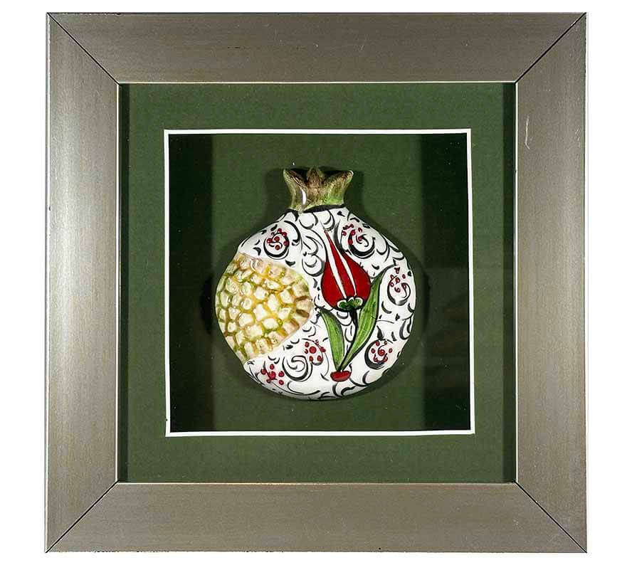 Kırmızı Lale – İznik Çinili Nar Plaket, İznik çini sanatının en güçlü sembollerinden biri olan lale motifini, bereketin simgesi nar formu üzerinde zarif bir kompozisyonla sunar. Kırmızı lalenin sade ama etkileyici duruşu; siyah rumi kıvrımlarla zenginleştirilmiş beyaz zemin üzerinde dengeli bir estetik oluşturur. Yeşil paspartu ve metalik çerçevesiyle birlikte klasik ve zamansız bir dekoratif eser ortaya çıkar.