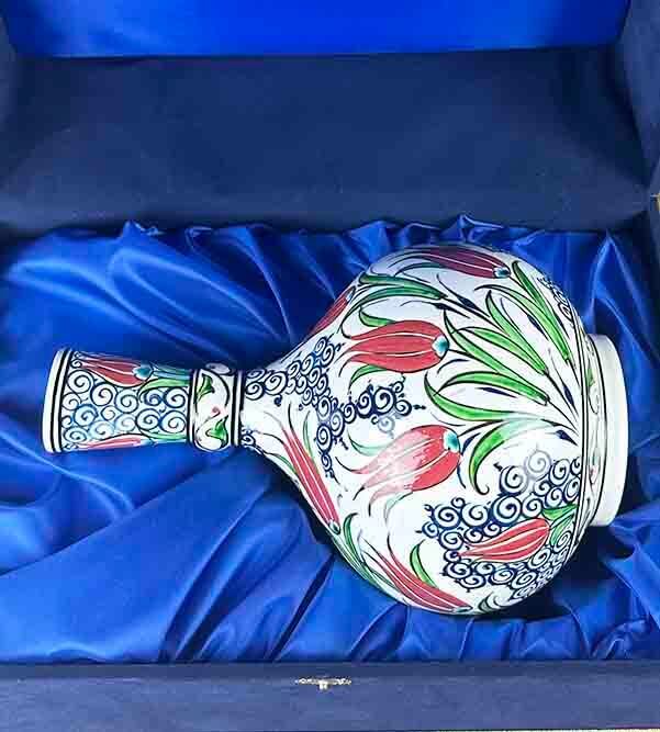 Her biri usta zanaatkârlar tarafından el işçiliğiyle boyanan bu İznik çini vazo, sır altı tekniği ile üretilmiş ve 800–1000 °C arasında fırınlanarak renklerin kalıcılığı sağlanmıştır. El yapımı üretim süreci nedeniyle her parça kendine özgüdür; birebir aynısı tekrar üretilemez.