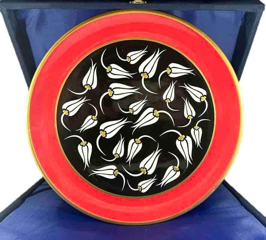 Offrez un chef-d’œuvre intemporel avec cette assiette en céramique d’Iznik de 30 cm, entièrement façonnée à la main selon la technique traditionnelle sous glaçure. Décorée du motif emblématique de la tulipe, elle symbolise l’amour, la beauté et la perfection. Présentée dans un élégant coffret VIP en bois recouvert de velours, elle est idéale comme cadeau d’entreprise ou décoration murale.