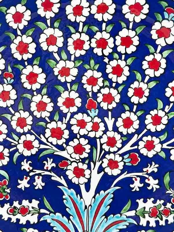 Lacivert zemin, derinlik hissi oluşturarak yaşam ağacının beyaz dallarını ön plana çıkarır. Turkuaz ve kırmızı detaylar ise çiçek formuna hareket ve canlılık katar. Kompozisyonun tamamı, Osmanlı minyatür düzeninin ritmik yapısını klasik İznik çini anlayışıyla harmanlayan özgün bir sanat dili sunar.