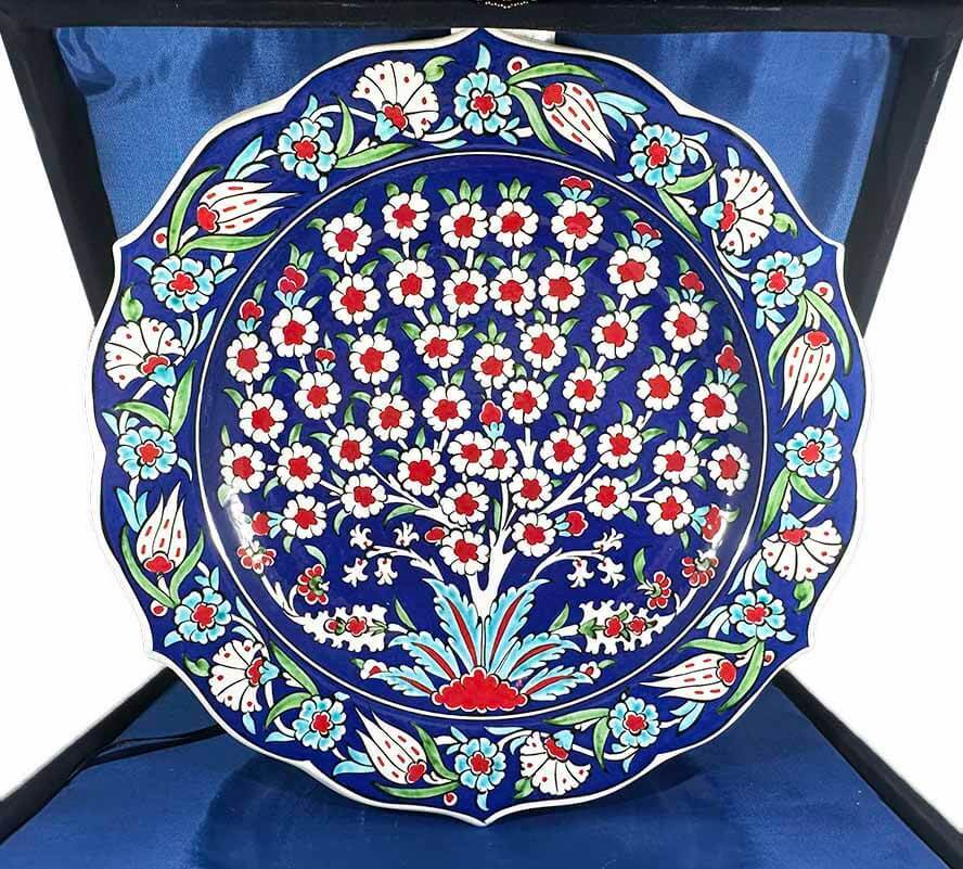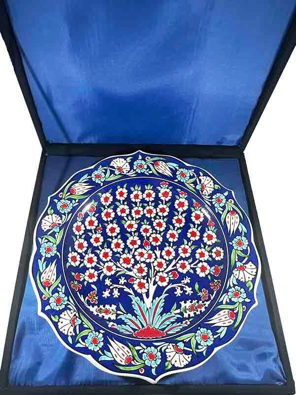 Usta çini sanatkârları tarafından tamamen el işçiliğiyle üretilen bu tabak, geleneksel sır altı tekniği ile yüksek sıcaklıkta fırınlanarak dayanıklı ve parlak bir yüzeye kavuşturulur. Renklerin kalıcılığı, desenin detayları ve yüzeydeki cam parlaklığı; İznik çinisinin yüzyıllardır süregelen sanat mirasının güncel bir yansımasıdır.