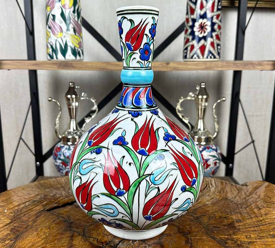 Lale Bahçesi Esintisi – İznik Çini Vazo, beyaz zemin üzerinde yükselen kırmızı lale motifleri, turkuaz geçişleri ve mavi çiçek detaylarıyla İznik çini sanatının ferah ve zarif karakterini yansıtır. Desenlerdeki akış duygusu, vazonun formuyla birleşerek bulunduğu ortamda canlı ama dengeli bir görünüm oluşturur.