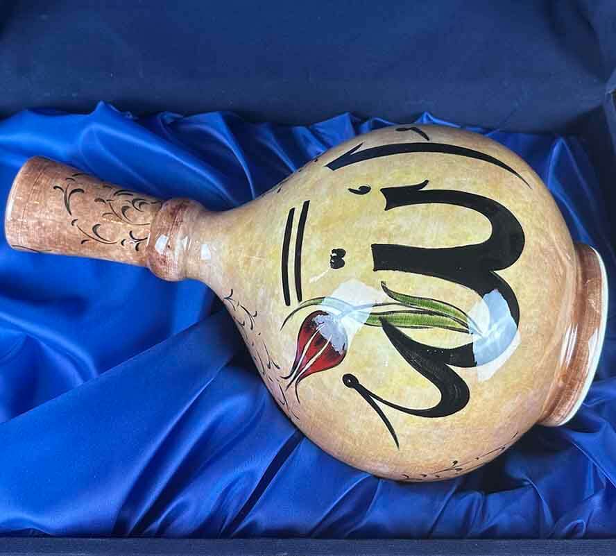 Lale Eşliğinde Allah Lafzı – İznik Çini Vazo, İznik çini sanatının manevî yönünü ve klasik estetik anlayışını aynı kompozisyonda buluşturan seçkin bir sanat eseridir. Toprak tonlarına yakın sıcak zemin üzerine yerleştirilen Allah lafzı, kompozisyonun merkezinde güçlü ve sakin bir odak oluştururken; zarif lale detayı bu anlatımı dengeli ve incelikli bir biçimde tamamlar.