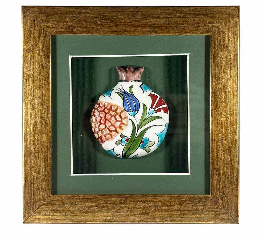 Lacivert–yeşil tonlu paspartusu ve altın renkli çerçevesiyle tamamlanan bu özel nar plaket, Osmanlı saray sanatından ilham alan güçlü ve zarif bir dekoratif eser olarak öne çıkar.