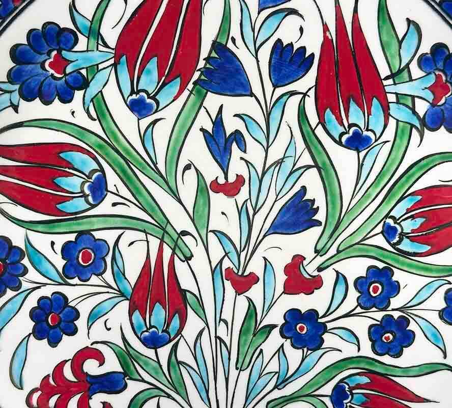 Klasik İznik çini sanatının en sevilen unsurlarını bir araya getiren bu özel tabak, zarif lale formları ve bereketi simgeleyen nar motifleriyle güçlü bir estetik sunar. Beyaz zemin üzerinde öne çıkan kırmızı nar detayları, mavi çiçekler ve akıcı yeşil dallar; tabağa hem canlı hem de seçkin bir görünüm kazandırır.