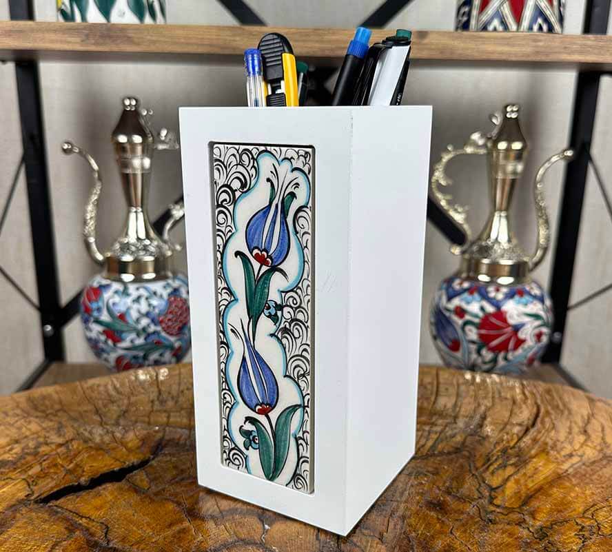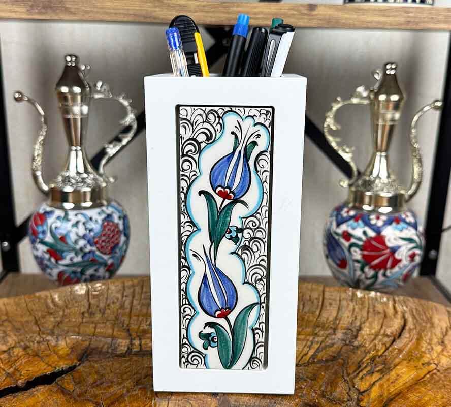 Çalışma masasındaki düzeni estetikle birleştiren ürünler, bulunduğu ortama doğrudan karakter kazandırır. Mavi Lale Zarafeti – İznik Çinili Ahşap Kalemlik, sade beyaz ahşap gövdesi ve zarif mavi lale motifli çini taşıyla masaüstünde hem kullanışlı hem de dikkat çekici bir görünüm oluşturur. Günlük kullanım için ideal olan bu özel parça, kalemlik işlevinin ötesine geçerek dekoratif bir masaüstü objesi haline gelir.
