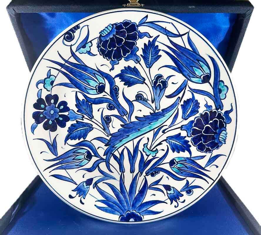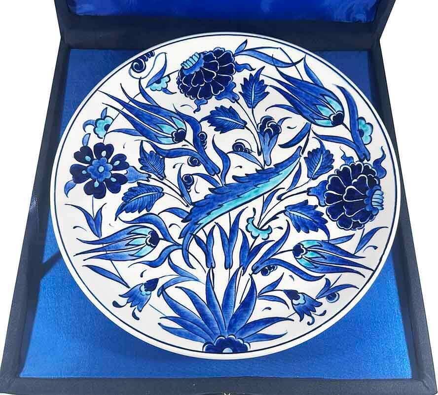 Mavi-beyaz İznik çini geleneğinin en zarif örneklerinden biri olan bu özel tabak, iri saz yaprakları ve klasik çiçek kompozisyonuyla güçlü bir estetik sunar. Tek renk mavi tonlarının verdiği dinginlik ve asalet, eseri hem dekoratif hem de kurumsal hediye olarak öne çıkarır.