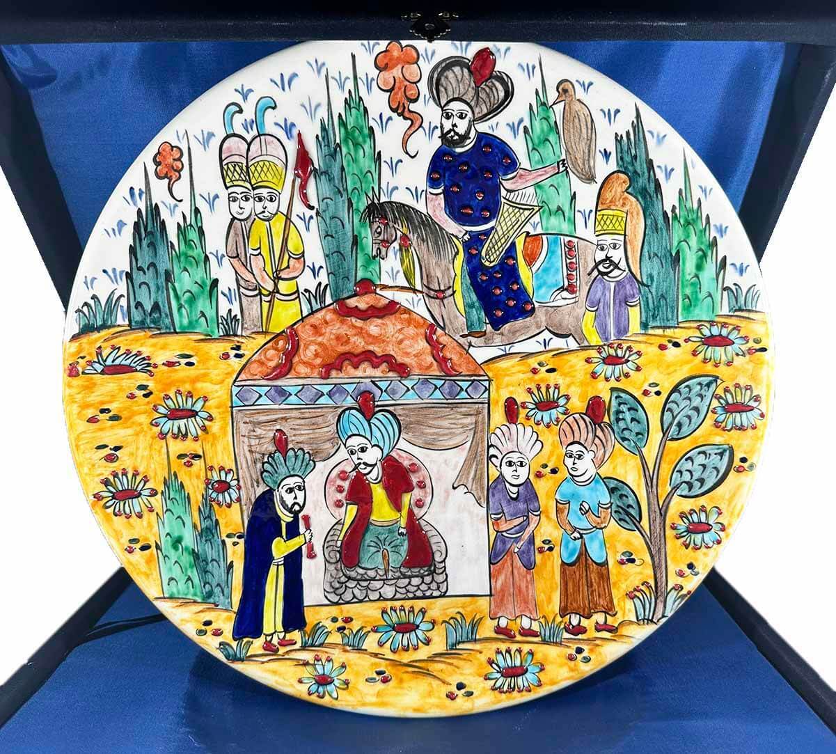 Osmanlı saray kültürünün diplomatik zarafetini yansıtan bu özel eser, “Hükümdara Elçi Kabulü” temasıyla tarihten bir sahneyi İznik çinisinin asırlık geleneğiyle buluşturur.