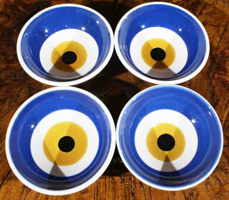 - Set of 4 handmade Iznik tile bowls with evil eye motifs