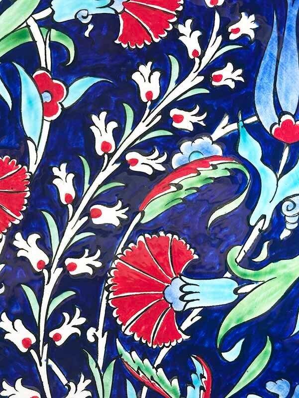Karanfil motifi ise sevgi, içtenlik, bağlılık ve zarafetle ilişkilendirilir. Kırmızı tonları sayesinde esere canlılık ve sıcaklık kazandırırken, duygusal anlamını da güçlendirir. Bu nedenle nişan gibi özel günlerde karanfil desenli İznik çinileri hem görsel hem sembolik açıdan çok kıymetli bulunur.