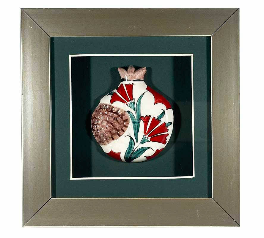 Osmanlı Karanfili – İznik Çinili Nar Plaket, Osmanlı döneminde sıklıkla kullanılan karanfil motifini, İznik çini sanatının karakteristik renkleriyle nar formu üzerinde yorumlar. Kırmızı karanfillerin güçlü ve asil duruşu; beyaz zemin üzerinde yeşil yapraklarla dengelenirken, belirgin nar taneleri kompozisyona bereket vurgusu katar.