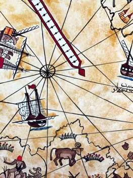 Le motif de la carte de Piri Reis est l’un des plus emblématiques de l’art céramique d’Iznik. Il représente la puissance maritime, l’audace exploratrice et le savoir géographique de l’Empire ottoman. Piri Reis, célèbre amiral et cartographe du XVIe siècle, réalisa en 1513 une carte du monde aujourd’hui considérée comme l’une des plus anciennes et des plus précises de son époque.
