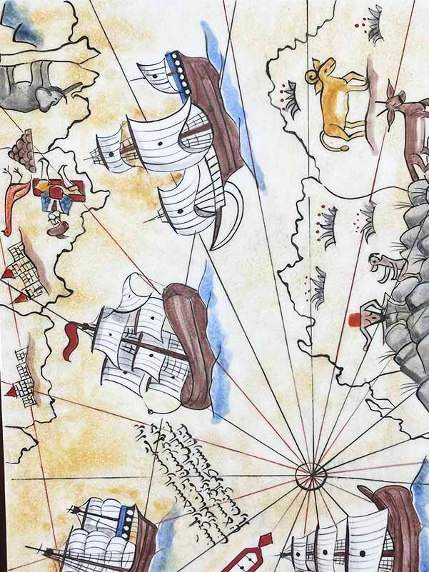 Desen, Piri Reis’in Kitâb-ı Bahriye ve dünya haritalarından ilham alan klasik Osmanlı harita üslubunu yansıtır.
