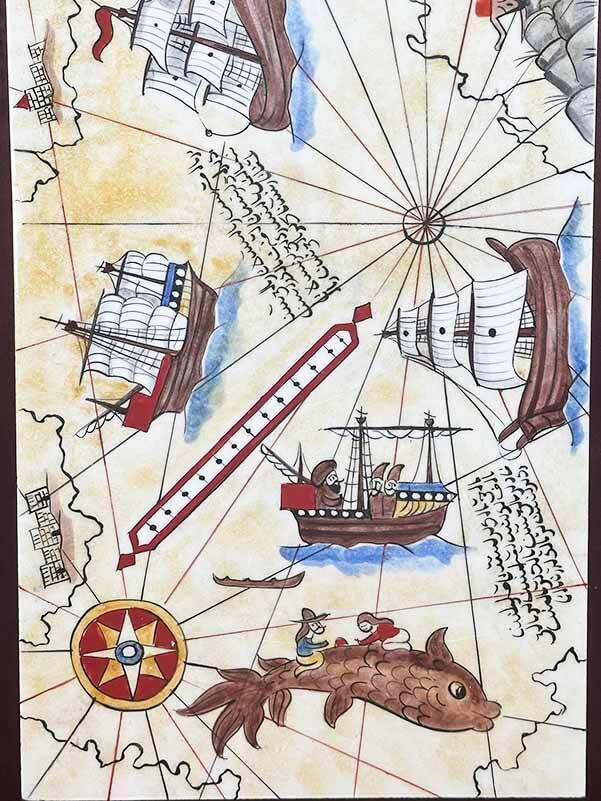 Deniz canlıları ve figürlü anlatım, dönemin haritacılık anlayışını ve gözleme dayalı çizim geleneğini temsil eder