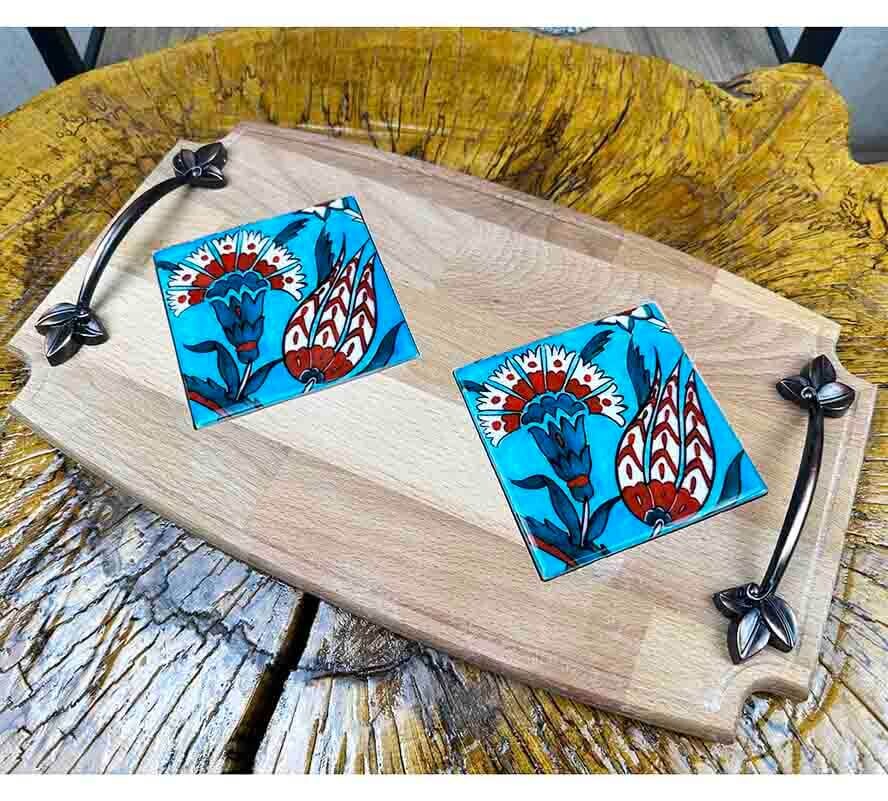 Ce plateau élégant en bois est composé de deux carreaux en céramique de 10x10 cm, décorés par impression à transfert avec des motifs floraux emblématiques de l’art d’Iznik : la tulipe et l’œillet. Ces deux fleurs, symboles forts dans la culture ottomane, incarnent ensemble l’amour, la beauté, la noblesse et la passion. Ce plateau est un choix raffiné pour la décoration ou comme cadeau chargé de sens.