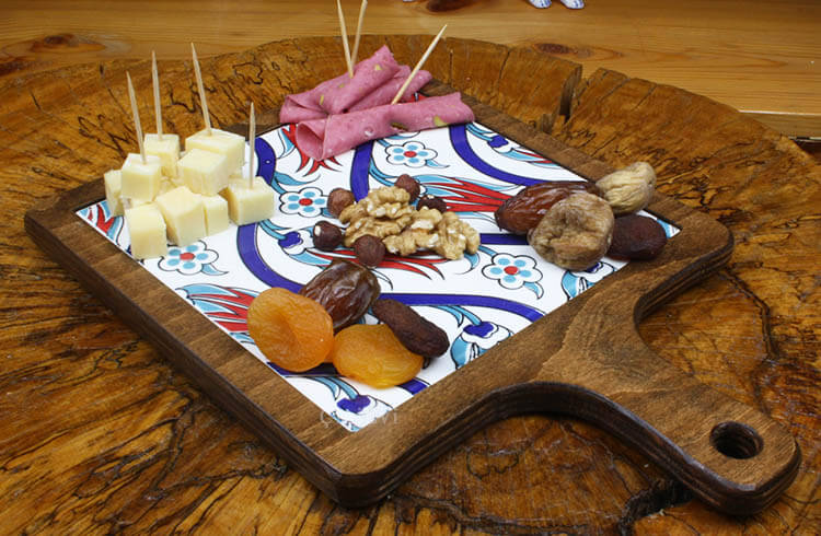 Ahşap malzeme seramik sunum tepsisi veya kesme tahtası olarak ta kullanılabilir