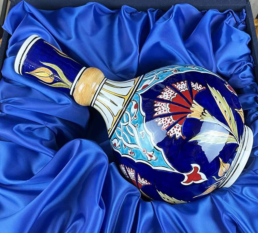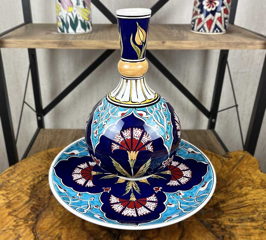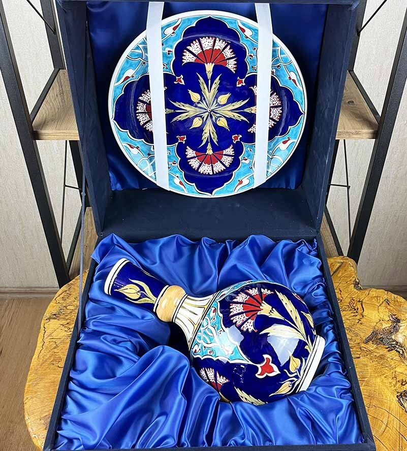 Lacivert zemin üzerinde öne çıkan karanfil desenleri, turkuaz geçişler ve dengeli kompozisyonuyla hazırlanan bu özel İznik çini seti; klasik saray estetiğini güçlü bir renk uyumuyla buluşturur. Vazo ve tabağın aynı desen diliyle hazırlanmış olması, ürünü yalnızca dekoratif bir takım olmaktan çıkarır; bulunduğu ortama sanat değeri, kültürel derinlik ve prestij katan özel bir İznik çini eserine dönüştürür.