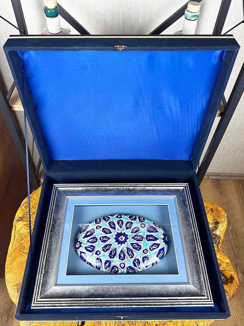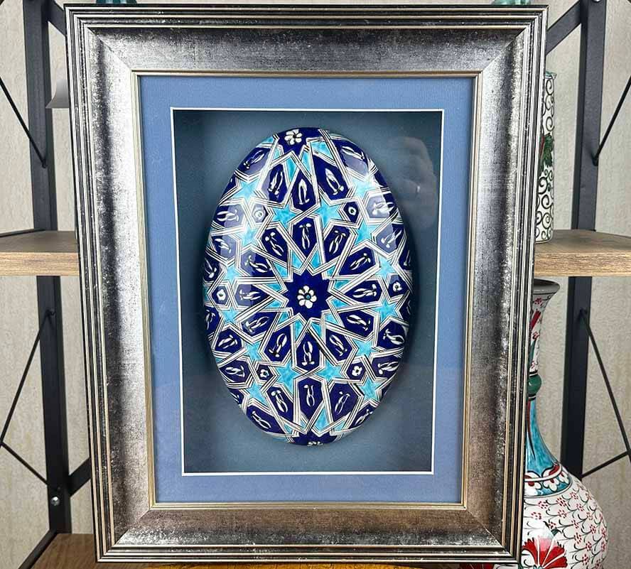 Bu el yapımı İznik çinisi, figüratif anlatımdan uzak, matematiksel ve mimari bir estetik anlayışla hazırlanmıştır. Selçuklu döneminde taş, ahşap ve çini süslemelerde sıkça kullanılan yıldız kompozisyonu, bu eserde sade ama etkili bir anlatımla yeniden yorumlanmıştır. Duvara asılabilir formu, paspartulu ve çerçeveli sunumu sayesinde ofisler, temsilcilikler, yönetici odaları ve seçkin yaşam alanları için uygundur.