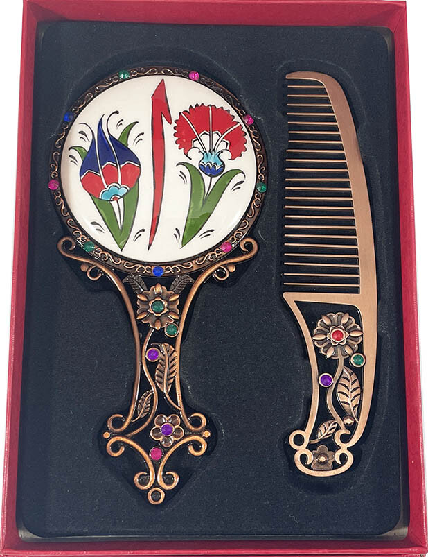 Sevgiliye Hediye Elif Motifli İznik Çini Ayna Seti,
