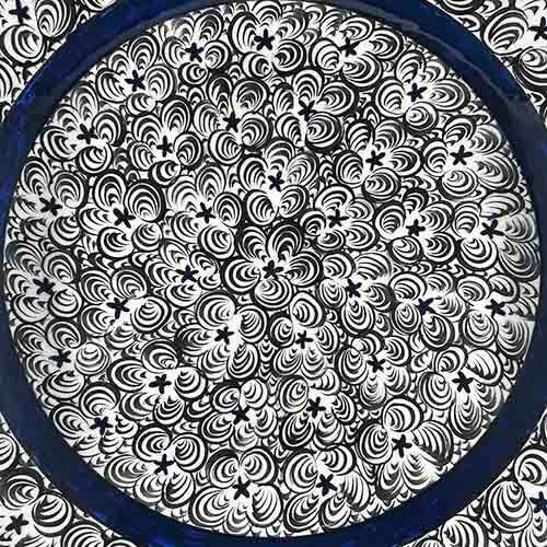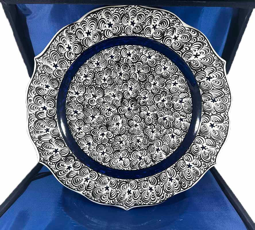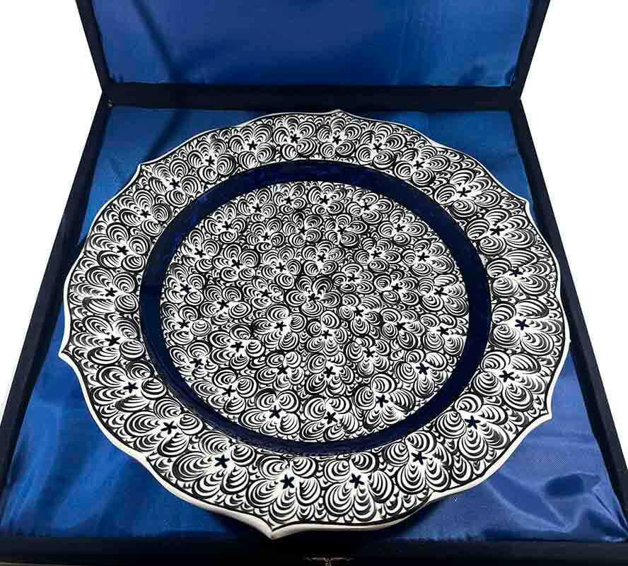 Siyah Beyaz Ahenk – İznik Çini Tabak, İznik çini sanatının zarif desen anlayışını sade ama etkileyici bir renk kurgusuyla buluşturan seçkin bir sanat eseridir. Siyah ve beyazın dengeli birlikteliği, tabakta güçlü bir görsel ritim oluştururken; lacivert bordür kompozisyona derinlik ve klasik bir çerçeve etkisi kazandırır.