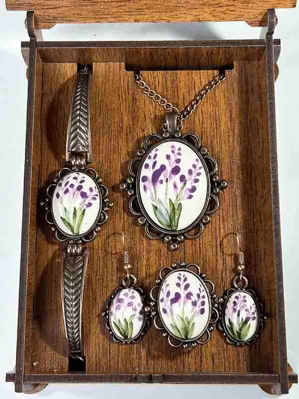 Otantik çini sanatının sümbül desenleriyle süslenmiş bu takı seti, el işçiliğinin ve sanatın mükemmel birleşimini yansıtır. Her parça, tarihi motiflerin modern bir yorumu olarak tasarlanmıştır. Bu eşsiz set, yalnızca zarafetiyle değil, aynı zamanda dayanıklılığı ve kalitesiyle de öne çıkar.