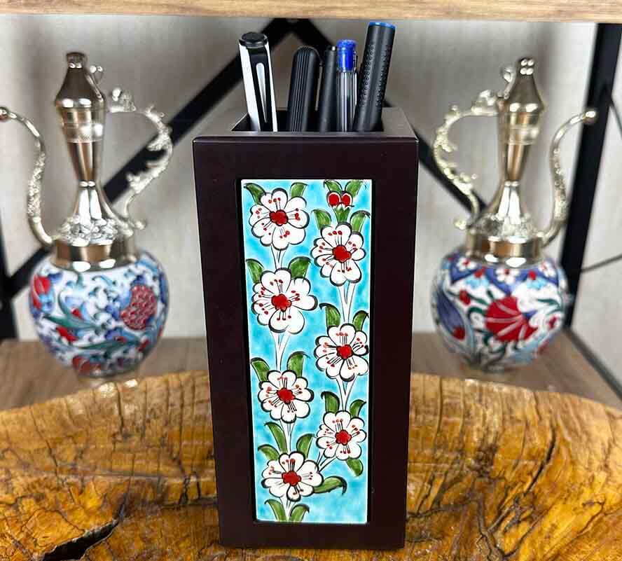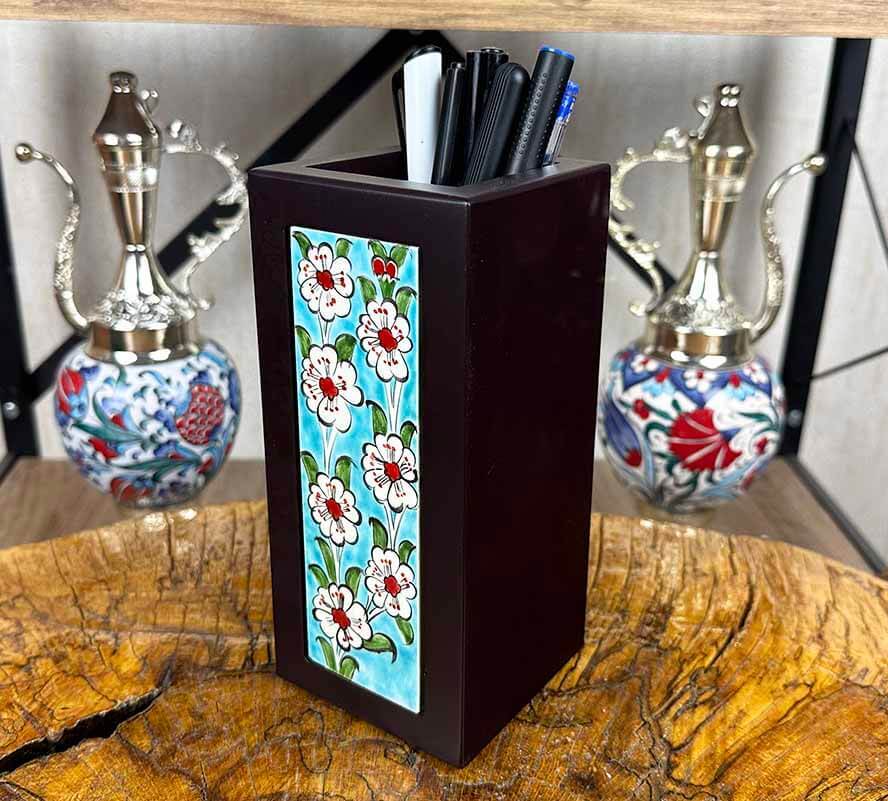 • Ahşap gövde üzerine çini taş uygulamalı dekoratif kalemlik