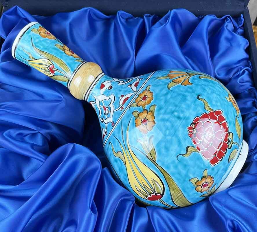 Turkuaz zemin üzerine işlenen lale, karanfil ve nar motifleriyle hazırlanan bu özel İznik çini seti; ferahlık, zarafet ve kültürel estetiği aynı kompozisyonda buluşturur. Vazo ile tabağın birbiriyle uyumlu desen dili, ürünü yalnızca dekoratif bir takım olmaktan çıkarır; bulunduğu alana anlam, renk ve sanat değeri katan özel bir esere dönüştürür.