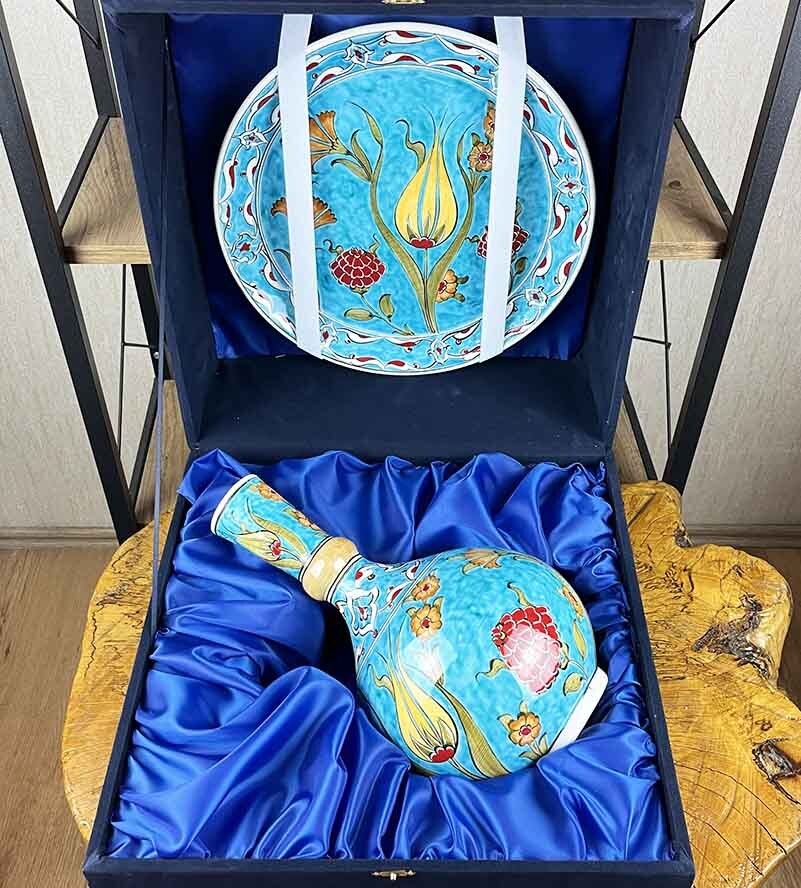 • Tamamen el işi olarak hazırlanmış İznik çini vazo ve tabak setidir