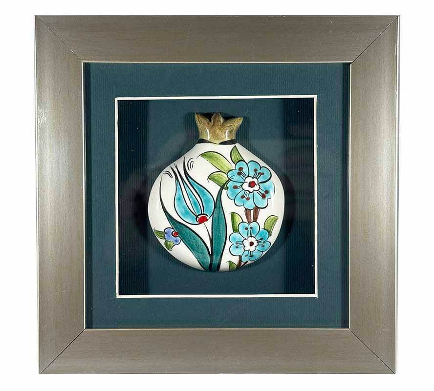 Turkuaz Zarafet – İznik Çinili Nar Plaket, İznik çini sanatının huzur veren turkuaz tonlarını, zarafetin simgesi çiçek ve lale motifleriyle nar formu üzerinde bir araya getirir. Turkuaz ve mavi çiçeklerin yumuşak geçişleri, beyaz zemin üzerinde ferah ve dengeli bir görünüm oluştururken; yeşil yaprak detayları kompozisyona doğallık ve canlılık katar.