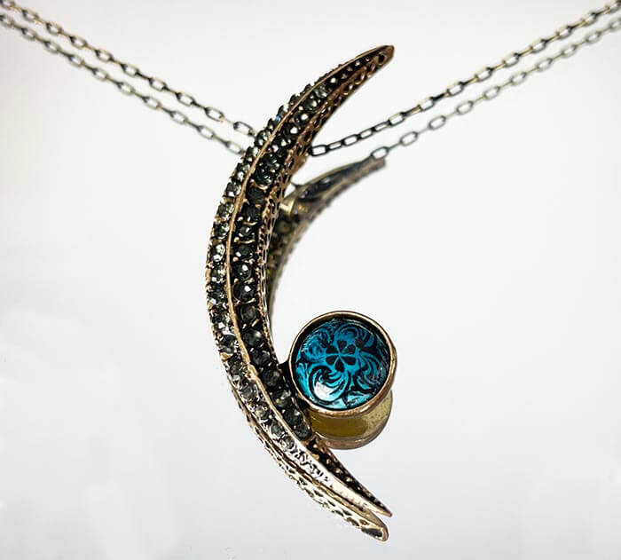 Halbmond-Bronzeanhänger mit türkisfarbenem Boden und goldenem Hornmotiv