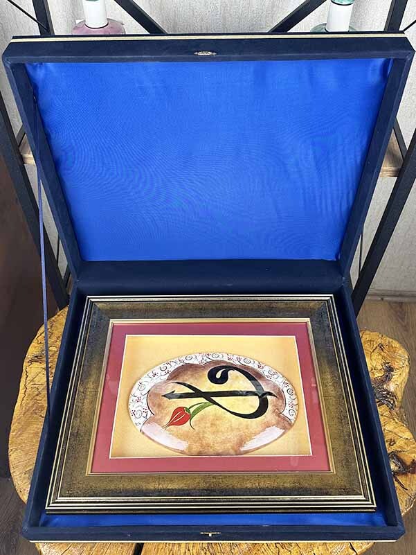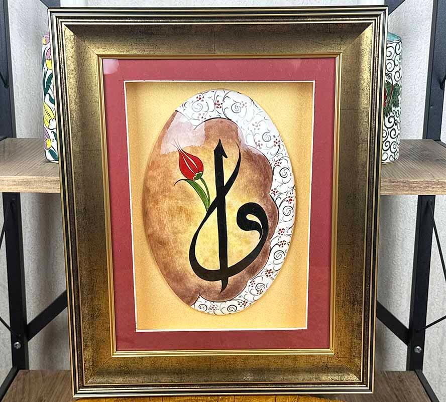 Lassen Sie mich wissen, wenn es eintrifftVav harfi ve lale motifinin aynı kompozisyonda buluştuğu bu paspartulu İznik çini eser, İslami sembolizmi sade ve dengeli bir estetikle yorumlayan özel bir duvar süsüdür. Manevî anlamı güçlü bu çalışma, yeni bir eve taşınırken hayırlı başlangıç, huzur ve teslimiyet temalarını temsil eder.