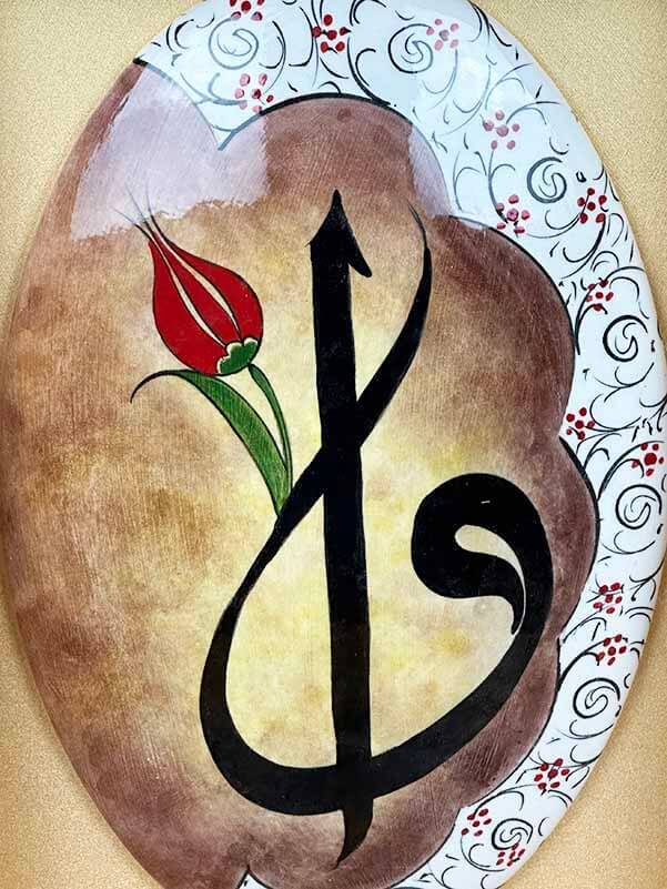 Vav harfi; tevazuyu, kulluğu ve Allah’a teslimiyeti temsil eden en güçlü İslami sembollerden biridir. Lale motifi ise tekliği ve Yaradan’a yönelişi simgeler. İznik çini sanatında bu iki motif birlikte kullanıldığında;